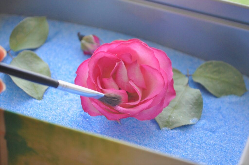 花の厚みや重なりを少し残したまま乾燥させる高度な技術です。吊り下げて自然乾燥させた後、乾燥剤の中に埋めます。