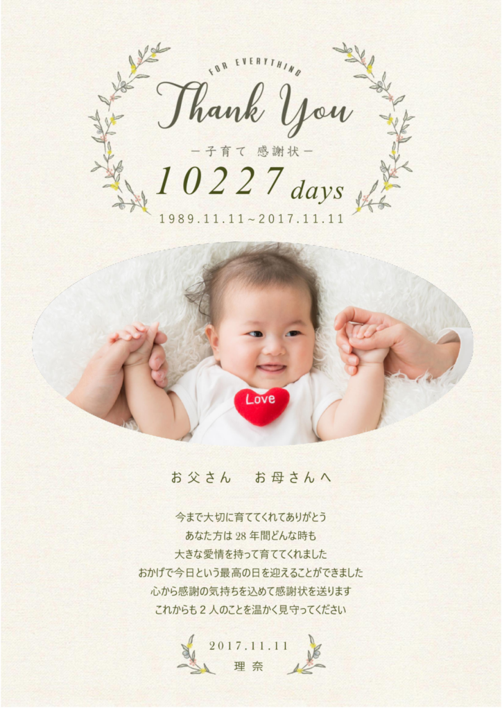 そこで今、演出の定番として注目されているのが「子育て感謝状」です。